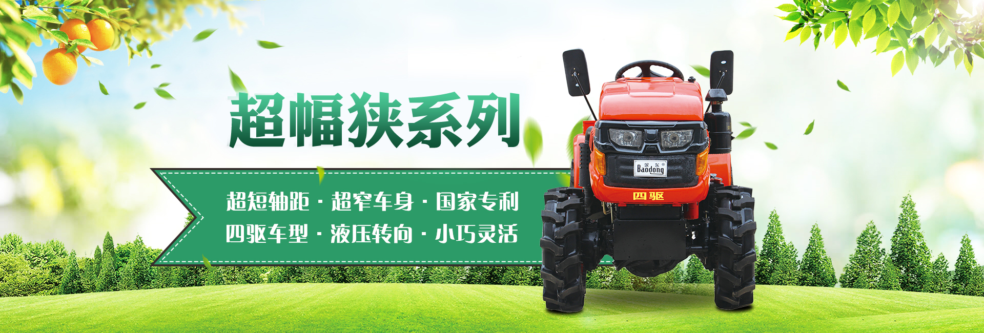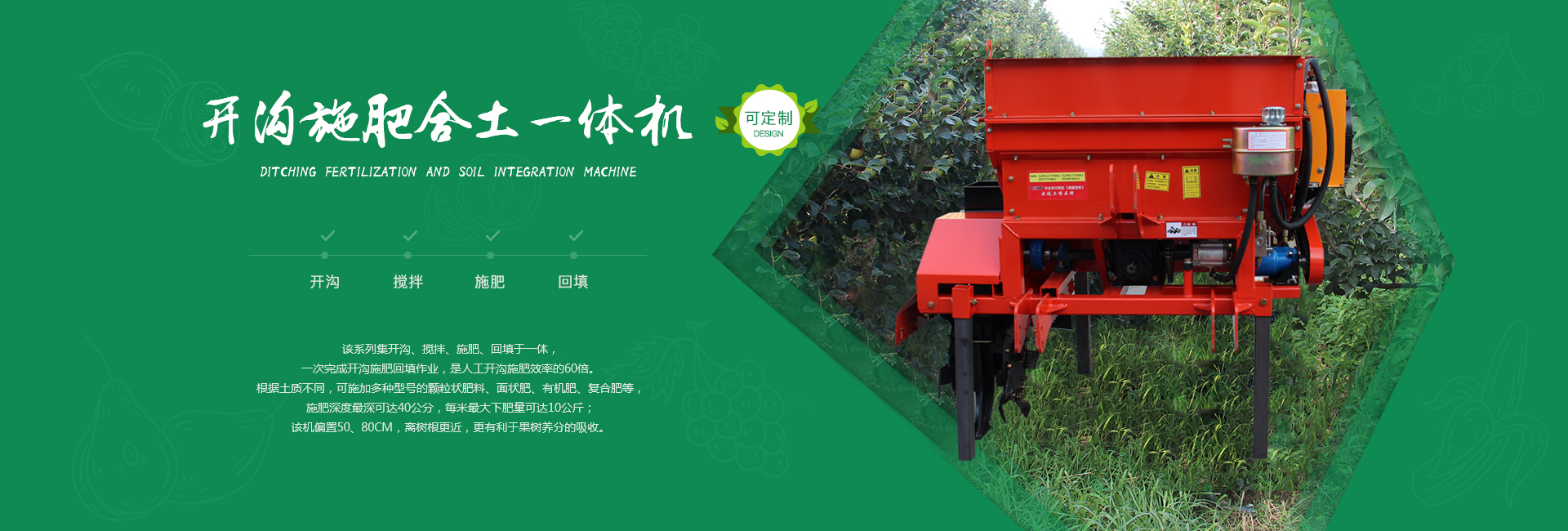 我公司主要經營產品有:果園管理機、拖拉機(窄距拖拉機、小型拖拉機、輪式拖拉機、山地拖拉機、四驅拖拉機)、果園施肥機(開溝施肥合土一體機、偏置開溝施肥復土一體機)、打藥機(風送噴霧打藥機、小型風送噴霧打藥機、大型風送噴霧打藥機、果園打藥機)、開溝機(中開溝機、偏置開溝機、果園開溝機)、粉碎還田機、果園打草機、碎枝機(大型碎枝機、開荒機、山地開荒機)、旋耕機(1米旋耕機、1.2米旋耕機、1.3米旋耕機、1.4米旋耕機、1.5米旋耕機以及偏置旋耕機)、雙鏵犁等。不斷研制出適應國內現代化果園需求的果園裝備系列產品,并取得國家多項專利。